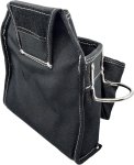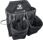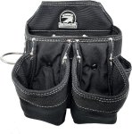 Designed to hold general tools and an assortment of wedge bolts and nails used in foundation setting. Features main compartment, 1 Upper pocket, 2 Large hanging pockets, 1 Utility knife pocket, 1 Pencil pocket, 1 Hammer loop.