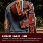 A reliable, job-ready hammer holder built for long-term use. This design features steel hardware sandwiched between two layers of 12 oz. premium leather to balance durability with comfort. It accommodates standard hammers and fits belts up to 3 inches wide.