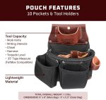 The most popular bag in the OxyLights™ line, this 3-pouch leather tool bag provides smart storage without extra bulk. It includes holders for pencils, work knife, lumber crayon, chisel, torpedo level, and hammer, along with a built-in tape holster sized for up to a 35' FatMax.